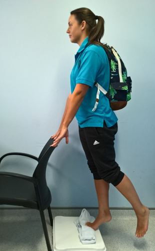 - On the edge of a step, standing on affected leg with towel rolled up under your toes.