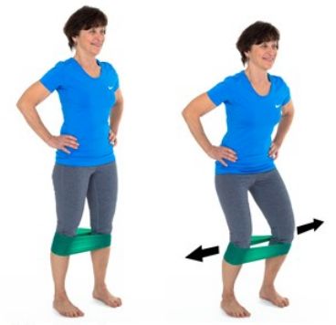 Bend your knees and hips as if you were sitting down. At the same time rotate your knees outwards against the resistance. The knees and toes should point in the same direction.
