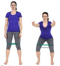 Stand with feet hip-width apart and an exercise band placed around your legs just above or under your knees with the slack taken off the band.