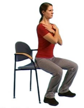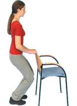 Stand up and then slowly sit down on the chair. The exercise can be made easier or more difficult by changing the height of the chair.