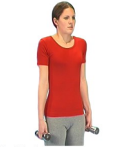 Stand tall, with arms by your sides, holding weights. You can use small weights or cans of beans.